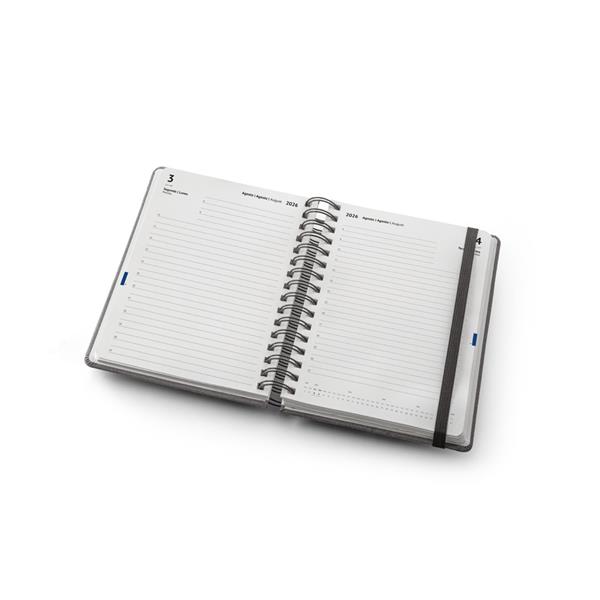 Agenda A5, com argolas, em pele (58% reciclada). Possui um elástico para fecho da agenda. Está organizada num plano diário (70 g/m²). Gravação da logomarca em 1 cor já inclusa.