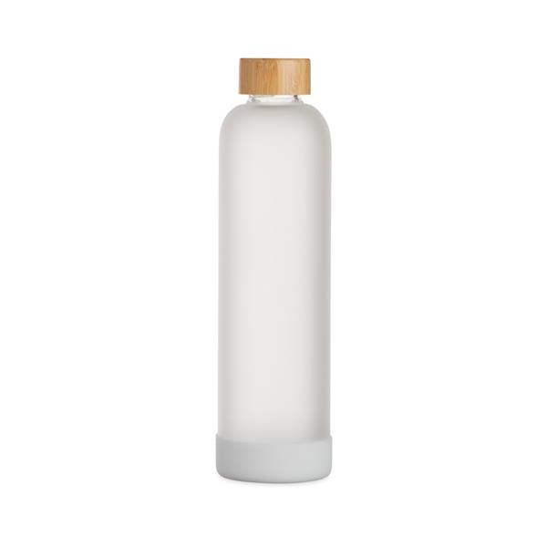 Garrafa com capacidade de 1 litro, feita em vidro borossilicato, conhecido pela resistência e durabilidade, capaz de suportar variações de temperatura, podendo ser levada à geladeira. Conta com tampa rosqueável de bambu e protetor anti-impacto removível em silicone. Gravação da logomarca em 1 cor já inclusa.