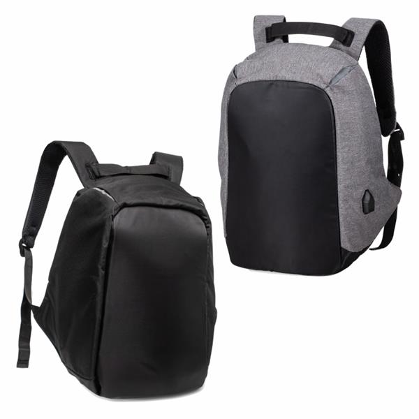 Mochila anatômica antifurto de 24 litros em poliéster resistente à água com dois compartimentos, sendo um deles exclusivo para cartões. Compartimento principal com amplo espaço e bolso para notebook 14, bolsos internos, suporte externo usb, alça para encaixe em malas de viagem e revestimento costado espumado. Gravação da logomarca em 1 cor já inclusa.