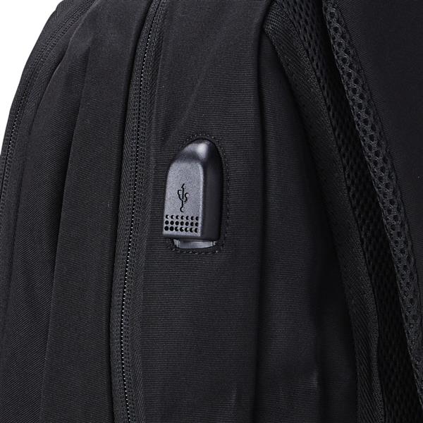 Mochila em poliéster 28 litros com seis compartimentos, sendo o principal com bolso para notebook 15,6 e tablet 12,4. Com divisórias internas para acessórios e porta chave, a mochila possui adaptador USB externo, bolsos laterais telados, duas alças de mãos, área costada e alças para as costas com revestimento espumado. Gravação da logomarca em 1 cor já inclusa.